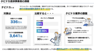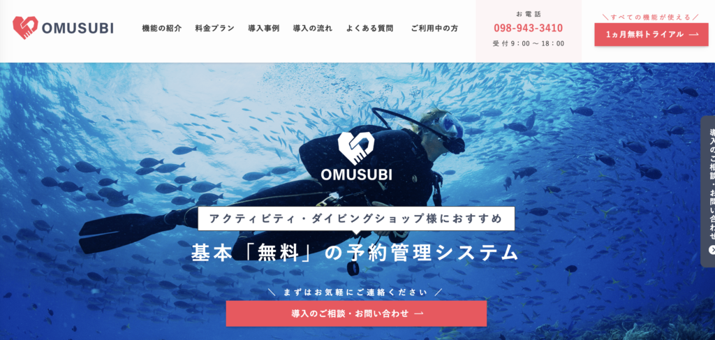 OMUSUBIとは、タビナカ事業者の自社HPの予約フォーム生成と各OTA(予約サイト)予約を一元管理できる予約システムです。予約受付・決済・顧客管理・集客(インバウンド対応)・分析を一元化して、タビナカ事業者のDX化をサポートします。デモ導入期間後、無料プランを含めた3つのプランから選択できます。全機能が使える最上位プランは成果報酬型のため余計なコストがかからず安心して利用できます。(※タビナカ:マリンスポーツなどの自然体験、琉球ガラス作りなどの文化体験、ガイドや食事を伴う観光バスツアーなど、旅行の現地体験を提供をするサービス)